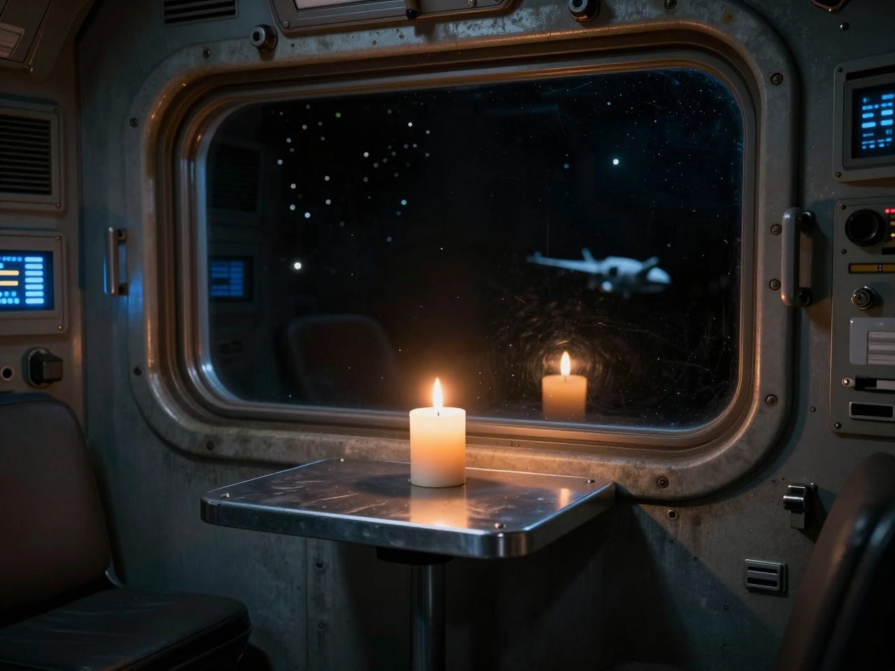 Later, after Yolanda had returned to her quarters with the candle tucked carefully in her pocket, Sora stood alone in the common area. The viewport showed the same stars it always showed: distant, cold, indifferent to human grief and human joy alike.