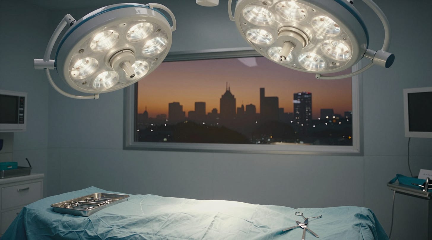 His hands moved. They had been moving for twenty years in rooms like this one, at tables like this one, under lights that turned everything the same flat white. The lights did not care what day it was. Neither did the wound.