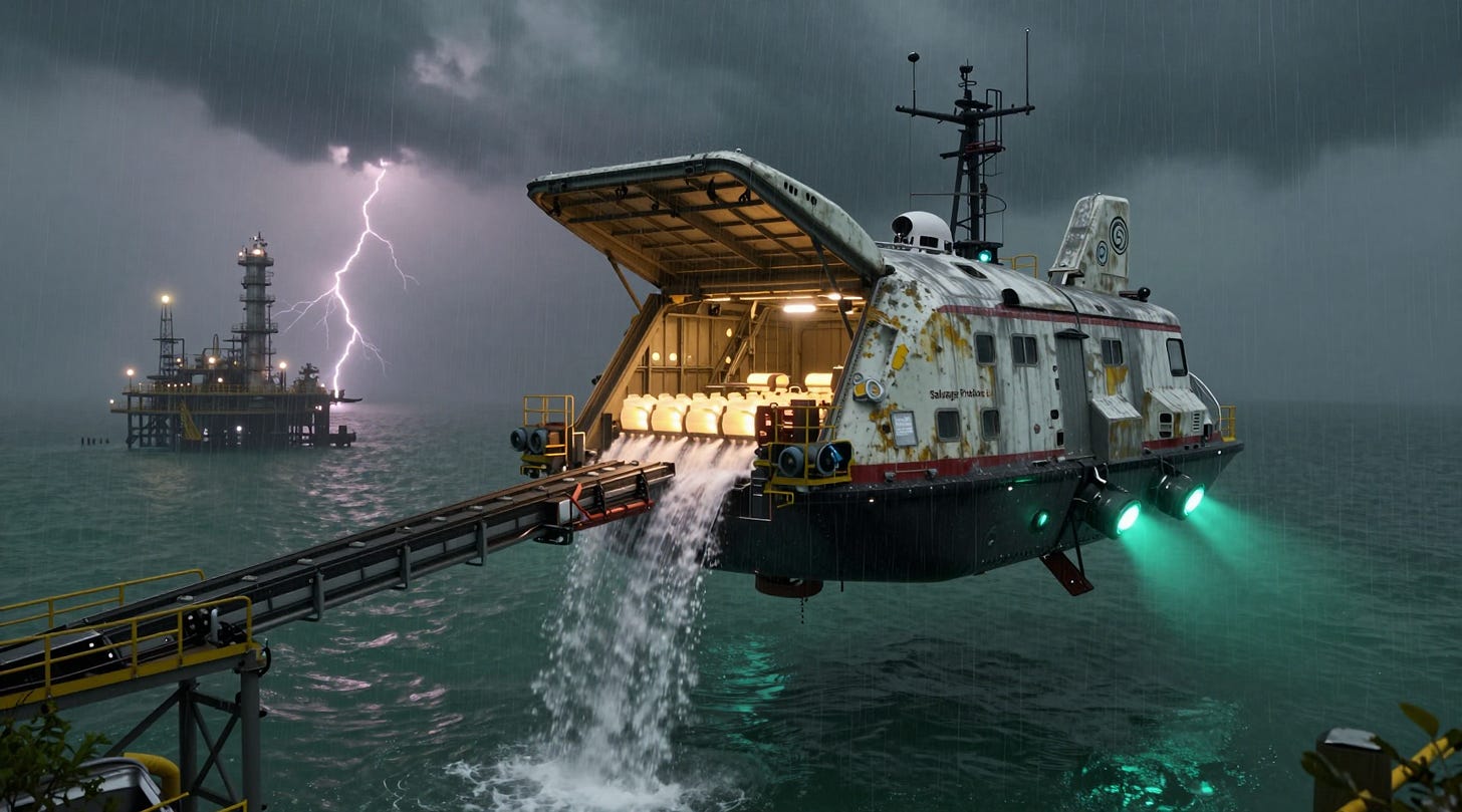 Author’s Note: Year 4 Post-Invasion, gulf relief crews ran cascade cells between flooded coastal settlements and inland fever domes while storms shredded every schedule. Njeri’s job is inspired by the real Salvage Protocol loadmasters who keep the western hemisphere alive with spreadsheets and grit.