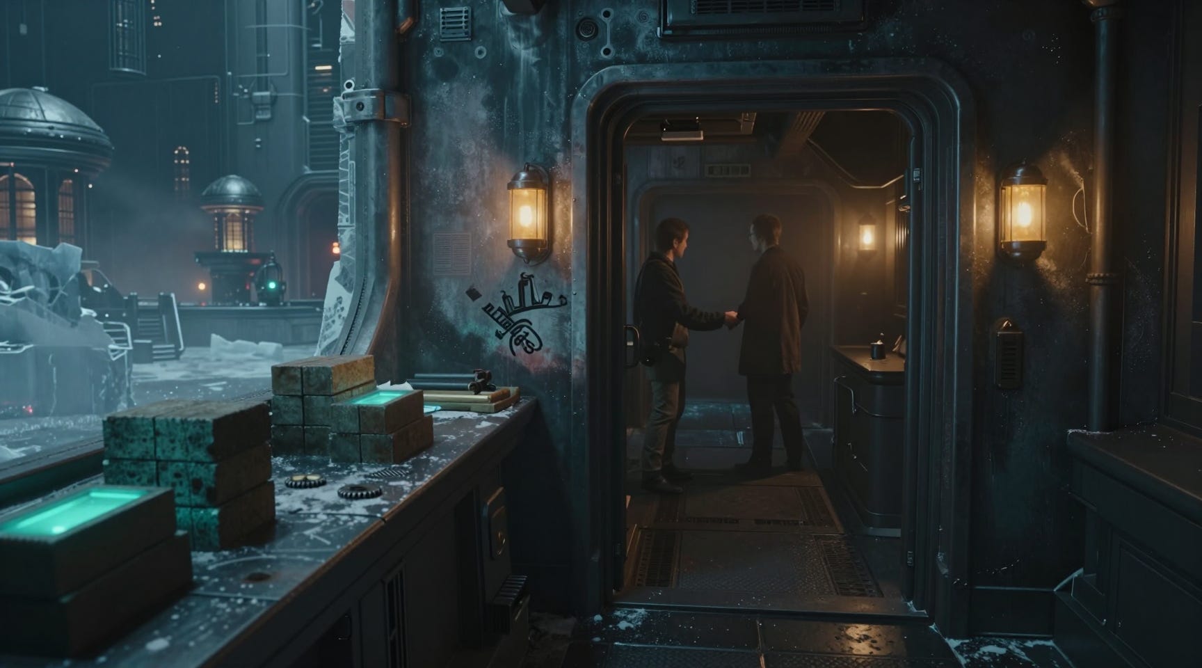 Her slate vibrated with the ping of a contraband transfer window. She slid it under the ration counter, gave the mothers hugging their canisters a tired nod, then eased through the maintenance hatch. Condensation crawled across the bulkhead in the tunnel below, turning the light into a blurred smear.