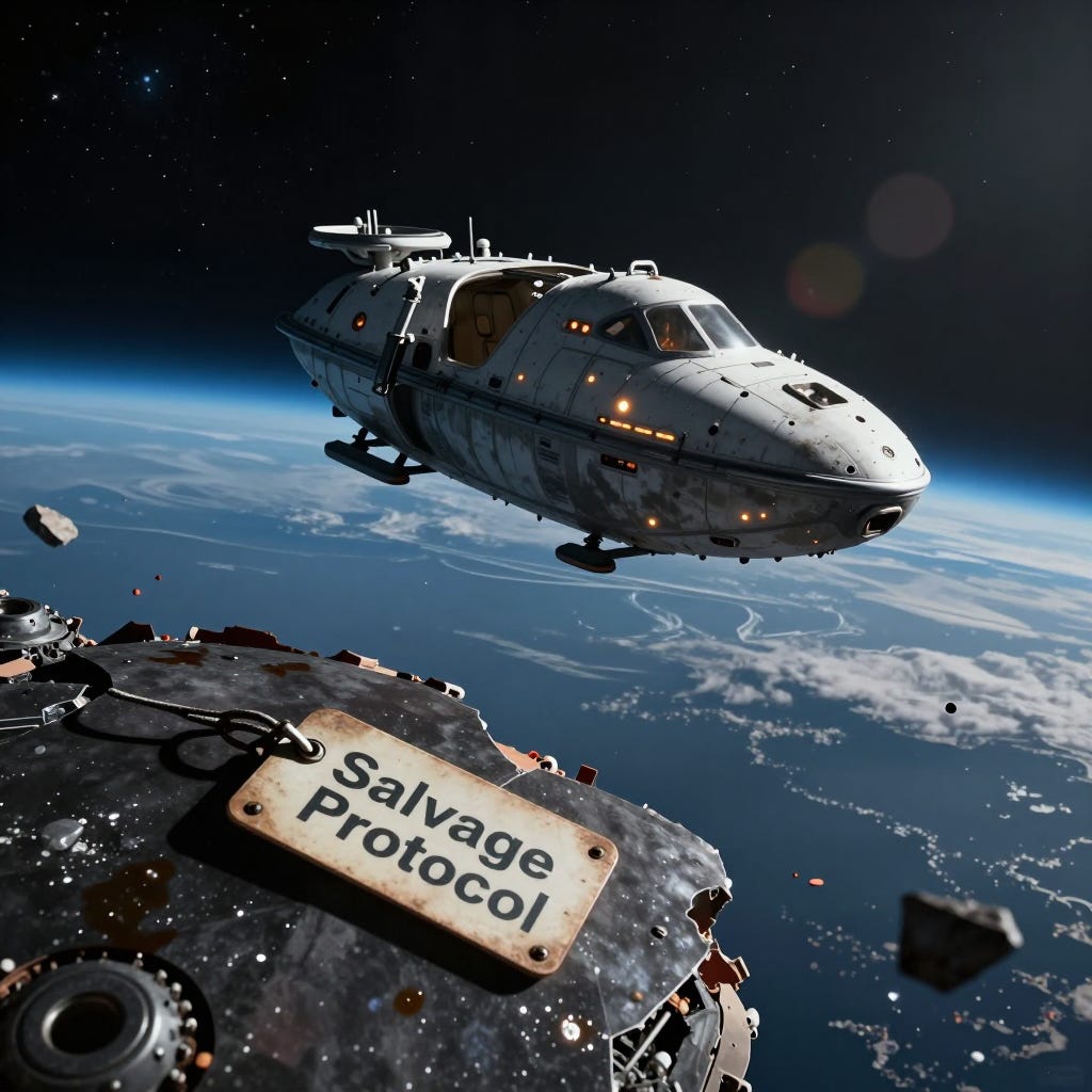 The skiff, the Rook, drifted a hundred meters off her shoulder, patched in mismatched metals and running on a thruster cluster that belonged in a museum. The tether line between them held steady, bright yellow against the blue curve of Earth.