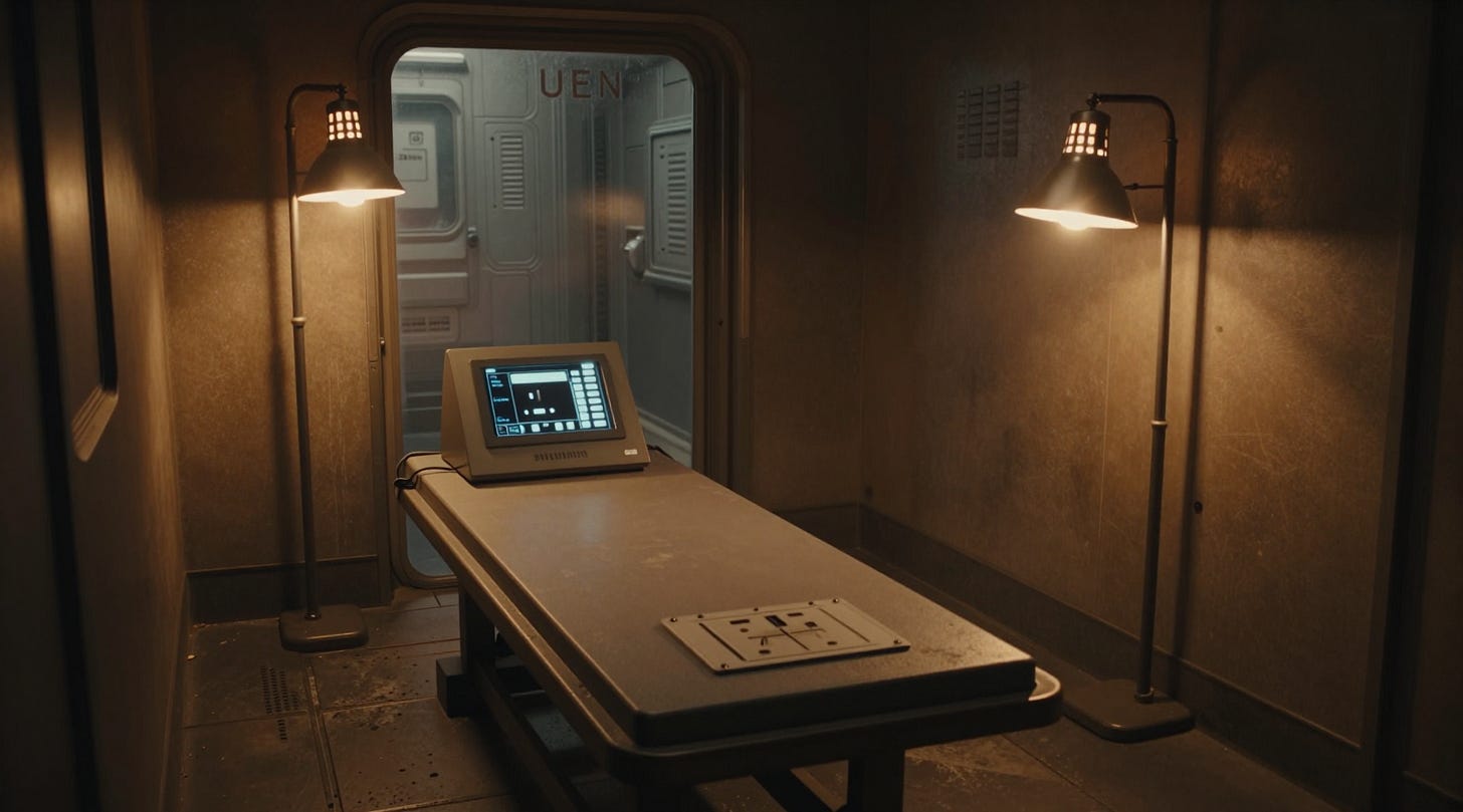 He sat. She pulled up the shop’s intake on her terminal, a low-grade interface she had built herself out of decommissioned station medical software, which scanned like any other biometric intake and generated none of the flags that the newer systems ran.
