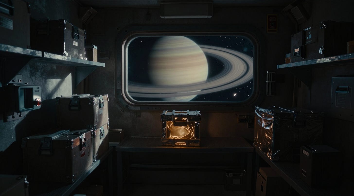 Outside the porthole, Saturn’s rings turned in silence, carrying debris from a war that had ended four years ago and never stopped taking.